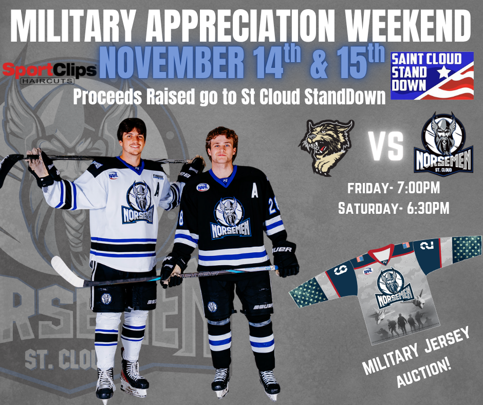 The St. Cloud Norsemen (6-8-3) host the Bismarck Bobcats (11-5-1) for Military Weekend presented by Sport Clips. Puck drop at the MAC is 7pm on Friday and 6:30 pm on Saturday. The Norsemen will be wearing specialty Military jerseys with an online auction from DASH starting Saturday at 10 AM. Proceeds will benefit St. Cloud StandDown. For tickets log onto tickets.stcloudnorsemen.com or buy at the door. Stream all the action as well on NAHLTV.com Powered by West Central Technology. Click on link below for coach Joe Exter’s interview on 98.1 Minnesota’s New Country.